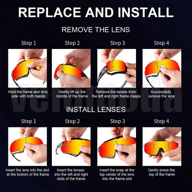 В комплект входит 4 линзы, в зависимости от погодных условий: 1 чёрная - поляризационная, 2 прозрачная - фотохромная , 3 прозрачная - UV400, 4 зеркальная красная - UV400.